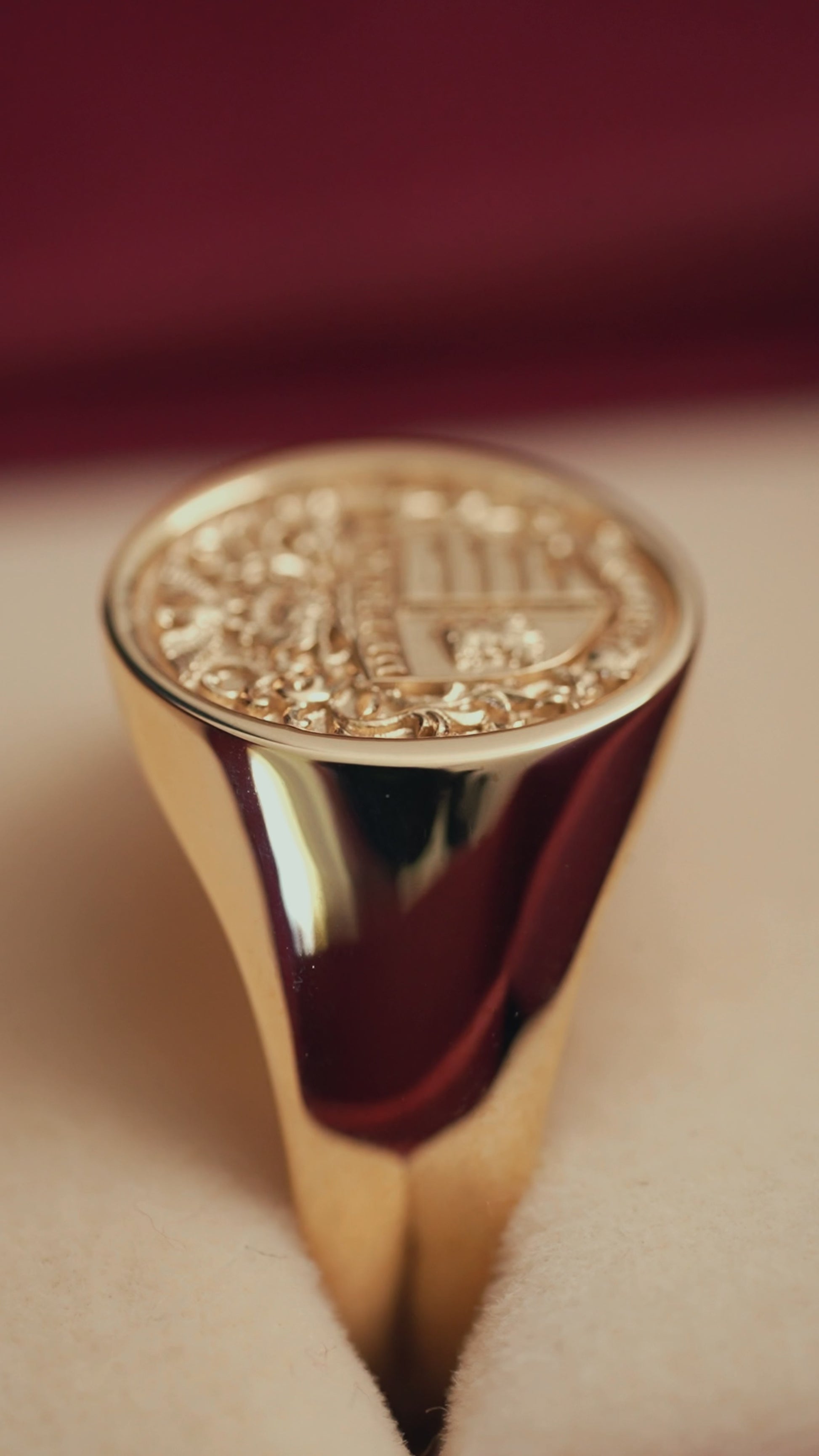 Once your ring is designed, we build a photorealistic 3D render, your exact gold, your exact crest or your stone, every detail visible exactly as it will be cast.